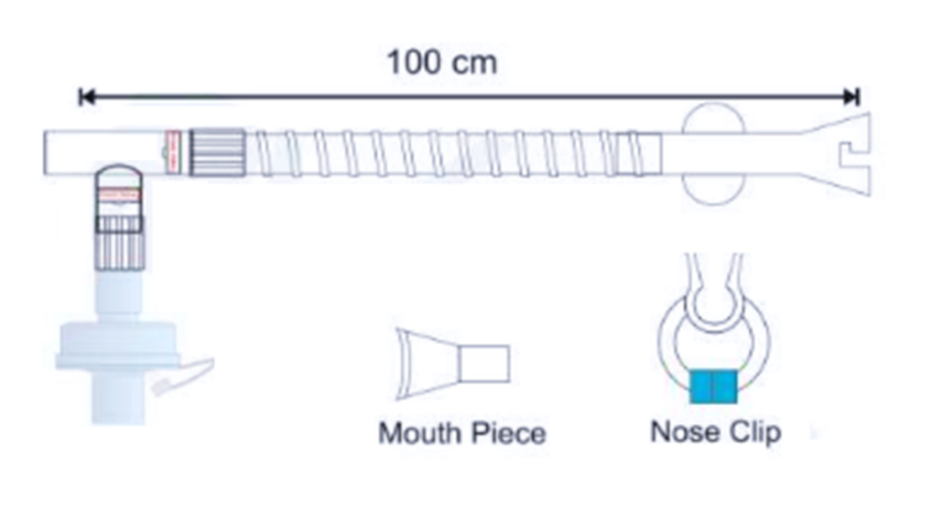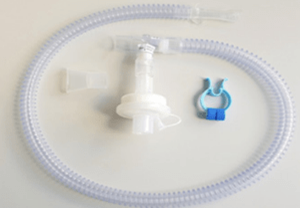 The inhalation breathing unit contains an exhalation filter, T-piece with two-way valve, a robust one meter smooth-bore tubing with 15mm inner diameter and the special generator connection. A rigid mouthpiece and a nose clip complete the set.